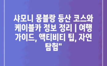 샤모니 몽블랑 등산 코스와 케이블카 정보 정리 | 여행 가이드, 액티비티 팁, 자연 탐험 샤모니 몽블랑은 아름다운 경관과 다양한 액티비티로 유명한 여행지입니다. 등산을 원하시는 분들을 위해 여러 가지 코스가 준비되어 …