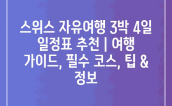 스위스 자유여행 3박 4일 일정표 추천 | 여행 가이드, 필수 코스, 팁 & 정보 스위스는 아름다운 자연경관과 매력적인 도시로 유명합니다. 3박 4일간의 여행 일정은 스위스의 하이라이트를 충분히 즐길 수 있는 …